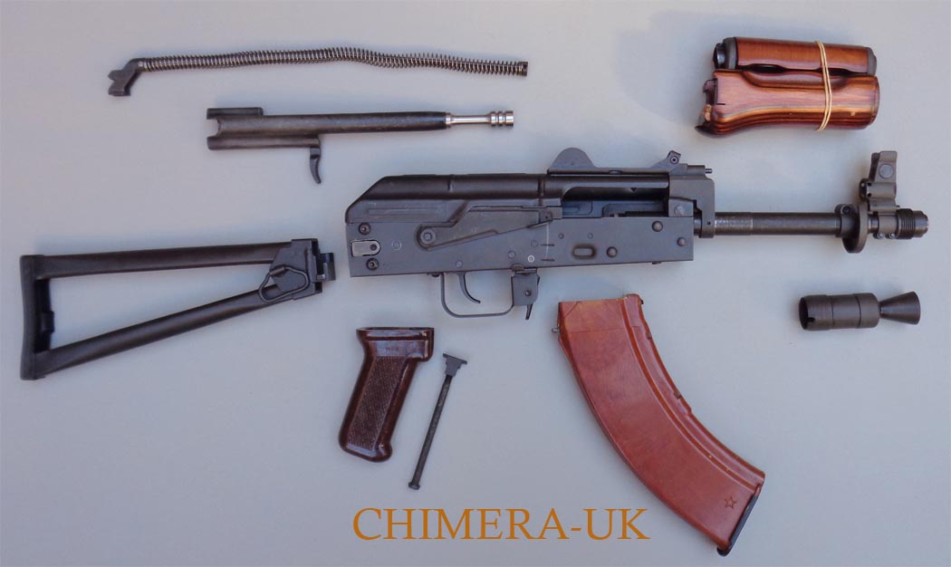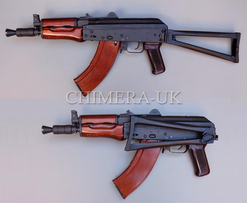 including the use of lathe in order to reduce the barrel width in 3 places, which requires the barrel to be taken off (£300) + barrel chemical blakenning. A real AK47 magazine filled with five 7.62mm inert rounds fits prefectly, but it is optional (£37). Essentially we build "DE-ACTIVATED" AKSU rifles with all moving parts, which are BB air rifles at the same time. They are cheaper then old spec deacts (!) and suitable for firearms training. A power upgrade comes as